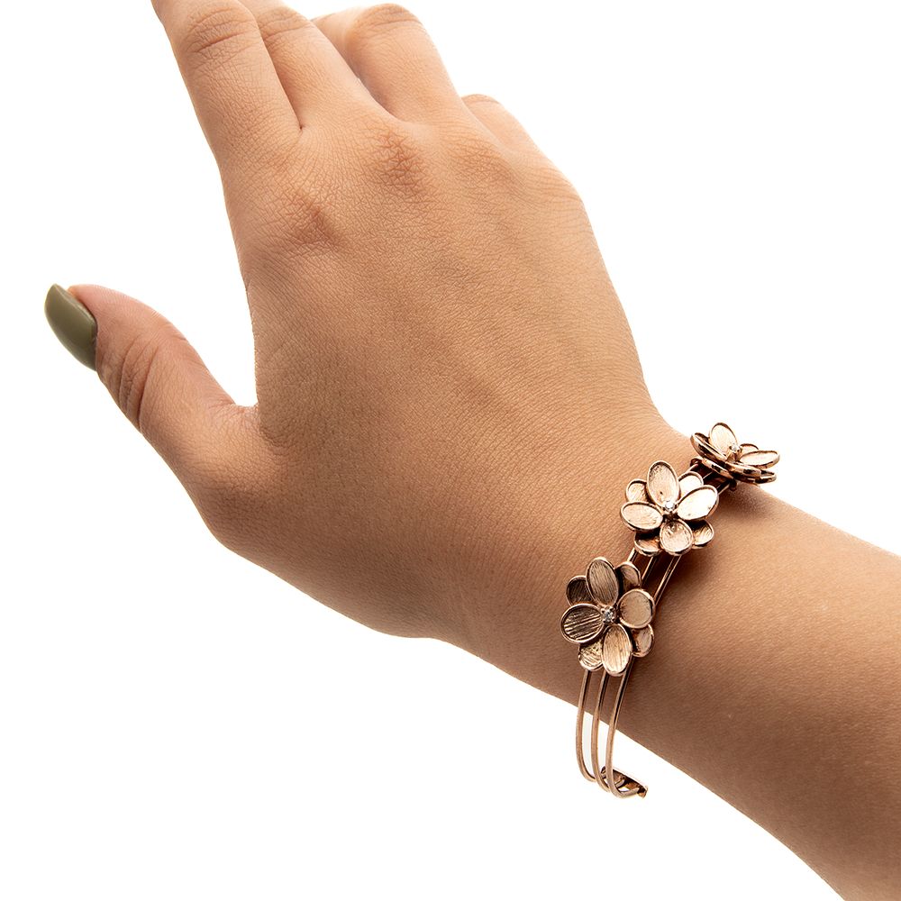 این دستبند نقره عیار ۹۲۵، یکی از زیورآلات دستساز و ظریف وبسایت آرتیسان گلد است که با طراحی الهامگرفته از طبیعت، زیبایی و لطافت گلها را به تصویر میکشد. بدنه دستبند از نقره استرلینگ عیار ۹۲۵ ساخته شده (۹۲.۵% نقره خالص با آلیاژهای مقاوم برای دوام بیشتر) و با آبکاری رزگلد برای رنگ گرم و جذاب، ظاهری لوکس و مدرن به آن بخشیده است. طراحی آن به صورت باز (کاف) است که به راحتی روی مچ قرار میگیرد و با سه گل ظریف (شبیه به گلهای پلومریا یا دیزی) تزئین شده؛ هر گل با گلبرگهای بافتدار و یک نگین کریستالی کوچک در مرکز، درخششی خیرهکننده ایجاد میکند. این نگینها احتمالاً کریستال سواروسکی یا الماس مصنوعی هستند که نمادی از شکوفایی و زنانگی به حساب میآیند. وزن تقریبی ۱۰-۱۵ گرم، سایز قابل تنظیم (۱۵-۱۸ سانتیمتر) و با گواهی اصالت عرضه میشود و با بستهبندی شیک برای هدیه مناسب است.