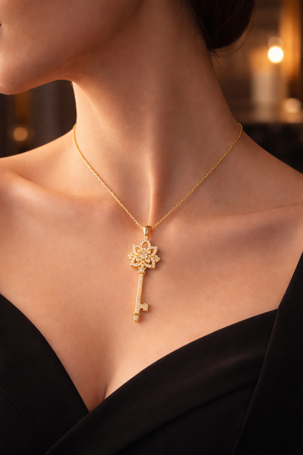 گردنبند «کلید اقبال» ترکیبی از طراحی نمادین و ظرافت جواهر است؛ کلیدی که قرار نیست فقط روی گردن بدرخشد، قرار است معنا داشته باشد.