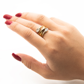 این انگشتر نقره ۹۲۵ از نقره خالص عیار ۹۲۵ ساخته شده که با ترکیب رنگهای مختلف (نقرهای، طلایی و رزگلد) ظاهری گرم و جذاب ایجاد میکند. طراحی آن شامل سه حلقه پیچیده به هم است که با سنگهای اشکی درخشان مزین شده، و ساختار ارگونومیک آن راحتی استفاده را تضمین میکند. وزن سبک (حدود ۶-۸ گرم بسته به سایز) و سایزبندی استاندارد (از ۴۹تا۵۴ با امکان سفارشیسازی) این جواهرات نقره دستساز را برای هر دستی مناسب میسازد. هر قطعه توسط هنرمندان ارتیسان گلد با تکنیکهای پیشرفته سنتی و مدرن ساخته شده تا دوام و اصالت آن حفظ شود.