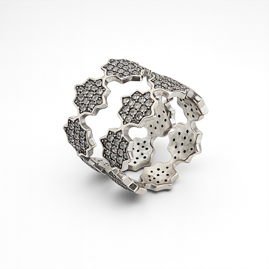 این انگشتر نقره عیار ۹۲۵ با طراحی ستارهای و مدرن، نمادی از elegance و هنر است. بدنه نقرهای با الگوی ستارهای و نگینهای ریز برلیانمانند، درخششی خیرهکننده ایجاد میکند. وزن تقریبی ۵-۷ گرم و سایز قابل تنظیم، آن را برای استفاده روزمره و مجالس مناسب میسازد. این انگشتر نقره زنانه برای بانوان شیکپوش، عاشقان جواهرات دستساز و کسانی که هدیهای خاص میخواهند، ایدهآل است.