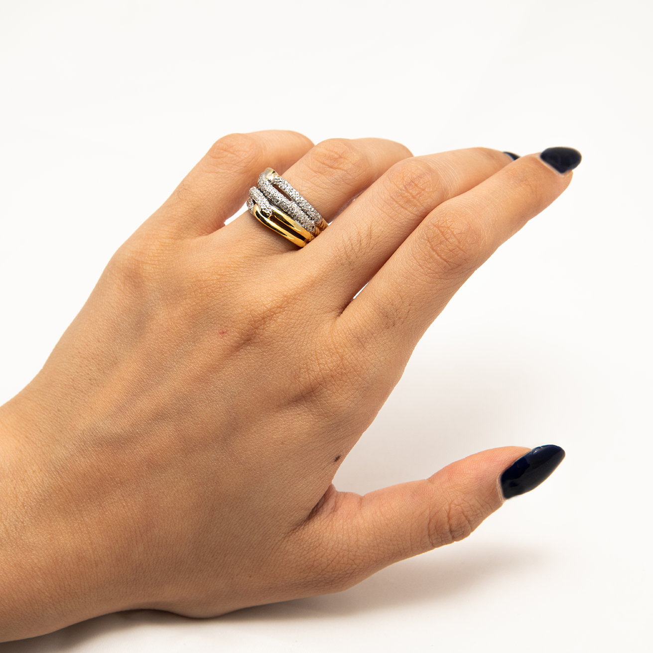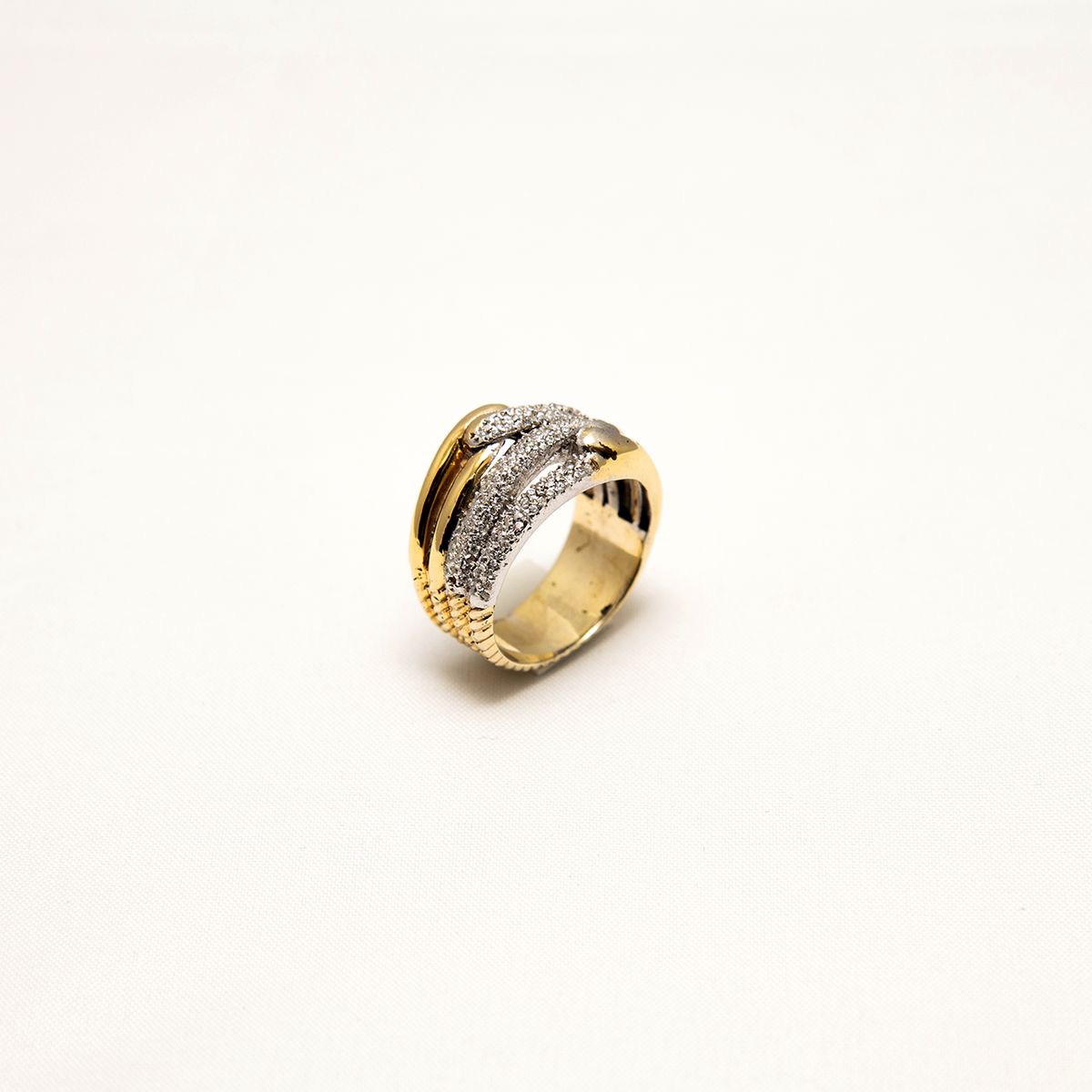این انگشتر نقره عیار ۹۲۵ با طراحی لایهای و لوکس، ترکیبی از زیبایی کلاسیک و مدرن است. بدنه طلاییرنگ با لایه میانی پوشیده از نگینهای ریز الماسی یا کریستالی درخشان، و لایههای بالا و پایین صاف و براق، جلوهای باشکوه ایجاد میکند. وزن تقریبی ۷-۹ گرم و سایز قابل تنظیم، آن را برای استفاده روزمره، مجالس و ست کردن با زیورآلات دیگر ایدهآل میسازد. این انگشتر نقره زنانه برای بانوان شیکپوش، علاقهمندان به جواهرات لوکس و کسانی که به دنبال هدیهای ماندگار برای مناسبتهای خاص هستند، مناسب است.