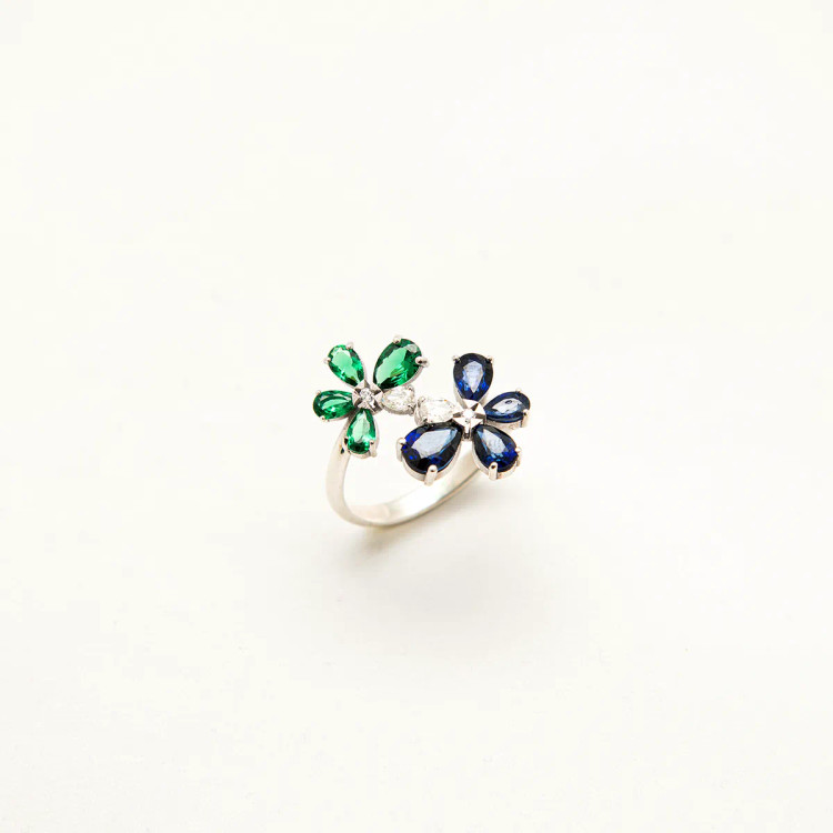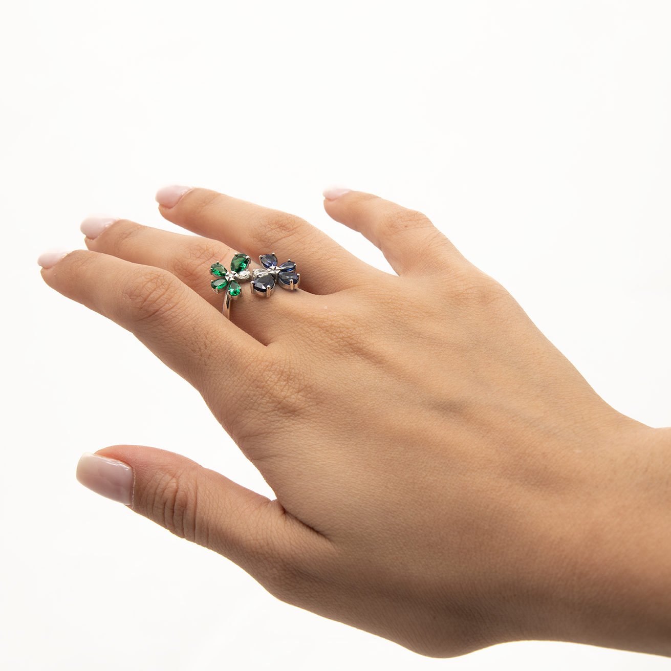 این انگشتر نقره عیار ۹۲۵ با طراحی پروانهای الهامگرفته از طبیعت، ترکیبی رمانتیک و رنگارنگ از زیبایی و ظرافت است. دو پروانه با نگینهای سبز زمرد (برش گلابی) و آبی یاقوت کبود (برش گلابی) در کنار نگینهای سفید درخشان (احتمالاً الماس مصنوعی)، روی بدنه نقرهای براق قرار گرفته و جلوهای زنده و چندرنگی ایجاد میکند. وزن تقریبی ۵-۷ گرم و سایز قابل تنظیم، آن را برای استفاده روزمره، مهمانیهای تابستانی یا ست کردن با لباسهای رنگی ایدهآل میسازد. این انگشتر نقره زنانه برای بانوان طبیعتدوست، عاشقان جواهرات رنگی و کسانی که هدیهای نمادین برای مناسبتهای خاص مانند تولد یا روز مادر میخواهند، مناسب است.