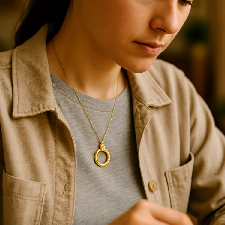 در مجموعه زیورآلات مینیمال آرتیسان گلد، آویز دایره نقره عیار ۹۲۵ همچون حلقهای از نور، نماد وحدت، بینهایت و تعادل در زندگی است. این گردنبند نقره ۹۲۵ آویز دایره با طراحی ساده و مدرن، یک حلقه باز صیقلی با قطرهای نگیندار (شبیه الماسهای درخشان) در بالا، از نقره استرلینگ عیار ۹۲۵ با روکش طلا ساخته شده که درخششی گرم و لوکس به آن میبخشد. وزن سبک (حدود ۴-۶گرم) و زنجیر قابل تنظیم (۴۰-۴۵ سانتیمتر) آن، برای استفاده روزانه ایدئال است و با روکش ضدحساسیت، برای پوستهای حساس مناسب میماند.